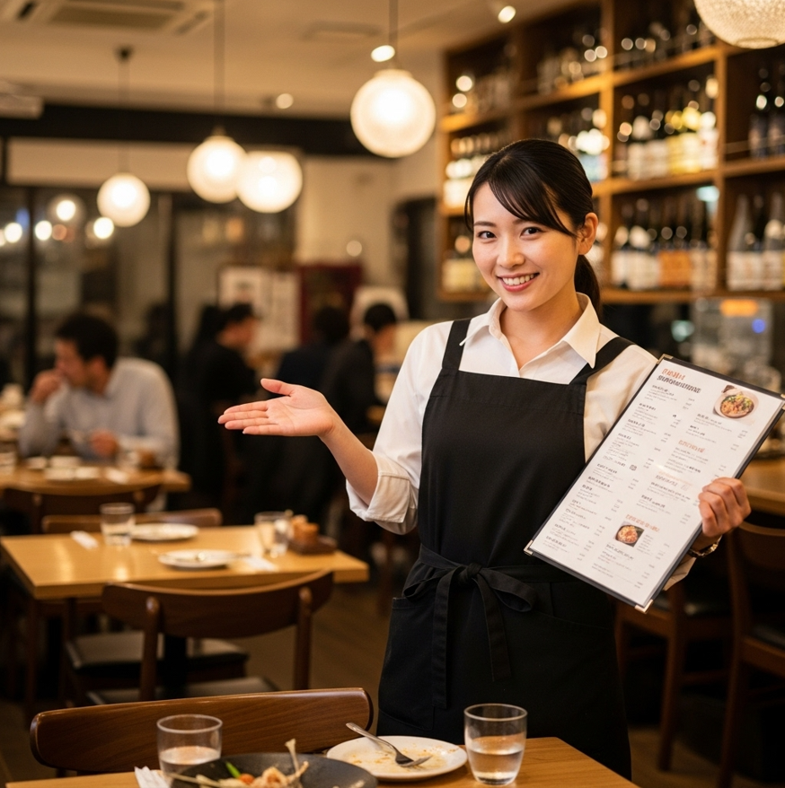 - ご案内〜注文: お客様がご来店したら、スムーズに席へご案内。オーダーもタイミングよくお伺いする。