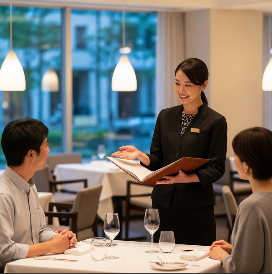 - 片付け: お客様をお見送り後、即座にテーブルを次のお客様のために完璧な状態にする。