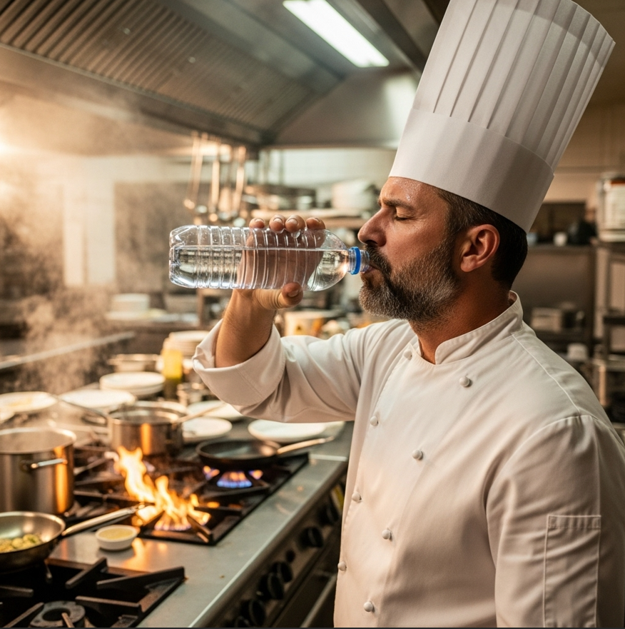 厨房内の温度は外気温よりも10℃以上高くなることも珍しくなく、40℃を超える環境で働くスタッフも少なくありません。こうした状況で、単に「水分をとりましょう」「扇風機を置きましょう」といった対策だけでは不十分なのです。